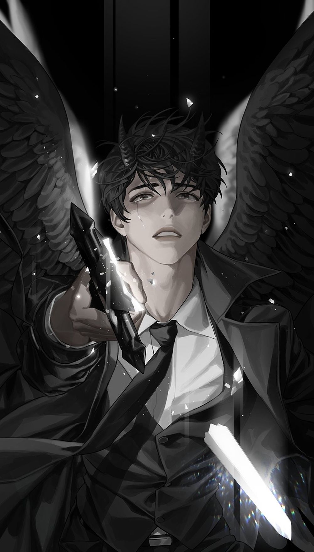 La hoja de la [Espada Divisoria del Cielo] brilló entre el abrigo negro azabache; un hombre que solo vivía para este momento estaba parado allí ahora.